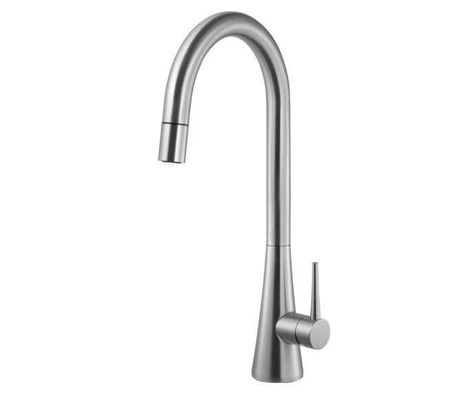 ברז מטבח נשלף Pull Down מסדרת קוני – עם פיה גבוהה מסתובבת, מזלף נשלף עלי מטה, ושני מצבי זרימה
